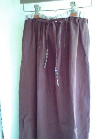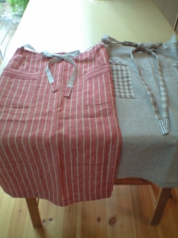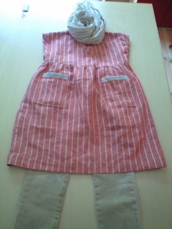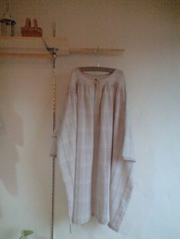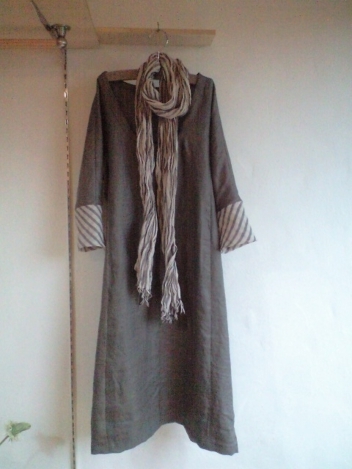 しっとりとした質感のリネンのワンピース。ストールとカフス部分をストライプにしてみました。こちらの布は、ザラッとした荒い質感のリネンです。
