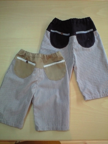 サイズ違いです。兄弟でお揃い…なんてどうでしょうか?同布でママサイズのパンツも作りました。