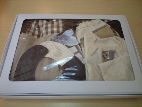 出産祝い用ギフトです。ママバック、オムツ入れ、80サイズの長袖カーディガン、ハーフパンツ、スタイが入ってます。男の子用ですが、ベージュ系をベースにやさしい感じに仕上がっています。