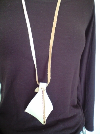 息子のお土産に、ピラミッド型の小銭入れを買いました。白い皮に赤い糸のステッチがあり、控えめに作家さんの刻印あり。首から下げられるよう、革紐はサービスです。