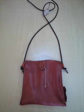 娘に買った皮のバック。既に使い込んだかのような風合いと、紙封筒を思わせる止め口が素敵です。
