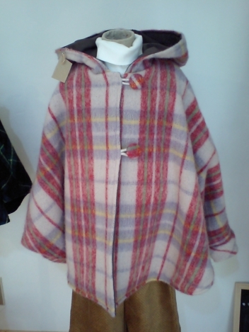 フード付きのコートです。ポンチョに見えますが、袖付きです。大きなくるみボタンがついています。