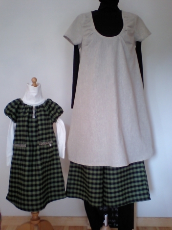 ダークな色のペアです。ママには幅広のパンツです。寒い日には、重ね履きもできるので重宝ですよ。