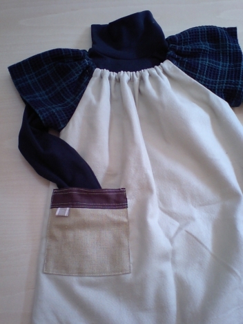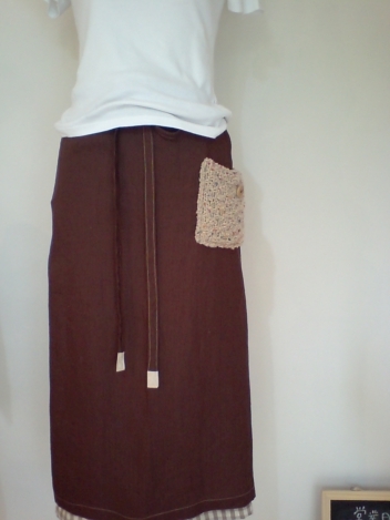 リネンのエプロンに、毛糸で編んだポッケットを付けてみました。