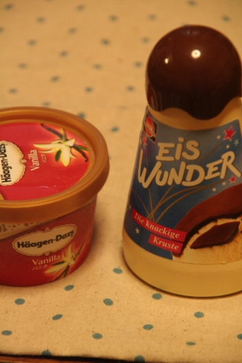 暑い夏は、やっぱり氷菓子だけど、ちょっと涼しくなったらアイスクリームが食べたい。右のボトルのチョコレートソースは、アイスにかけると固まるタイプのもの。