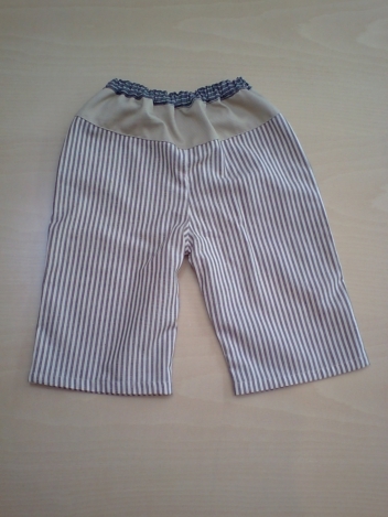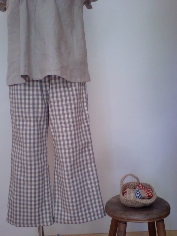 綿麻のしっかいりした布で作りました。ややゆったりめなパンツです。優しい色合いなので、合わせやすいのではないでしょうか?